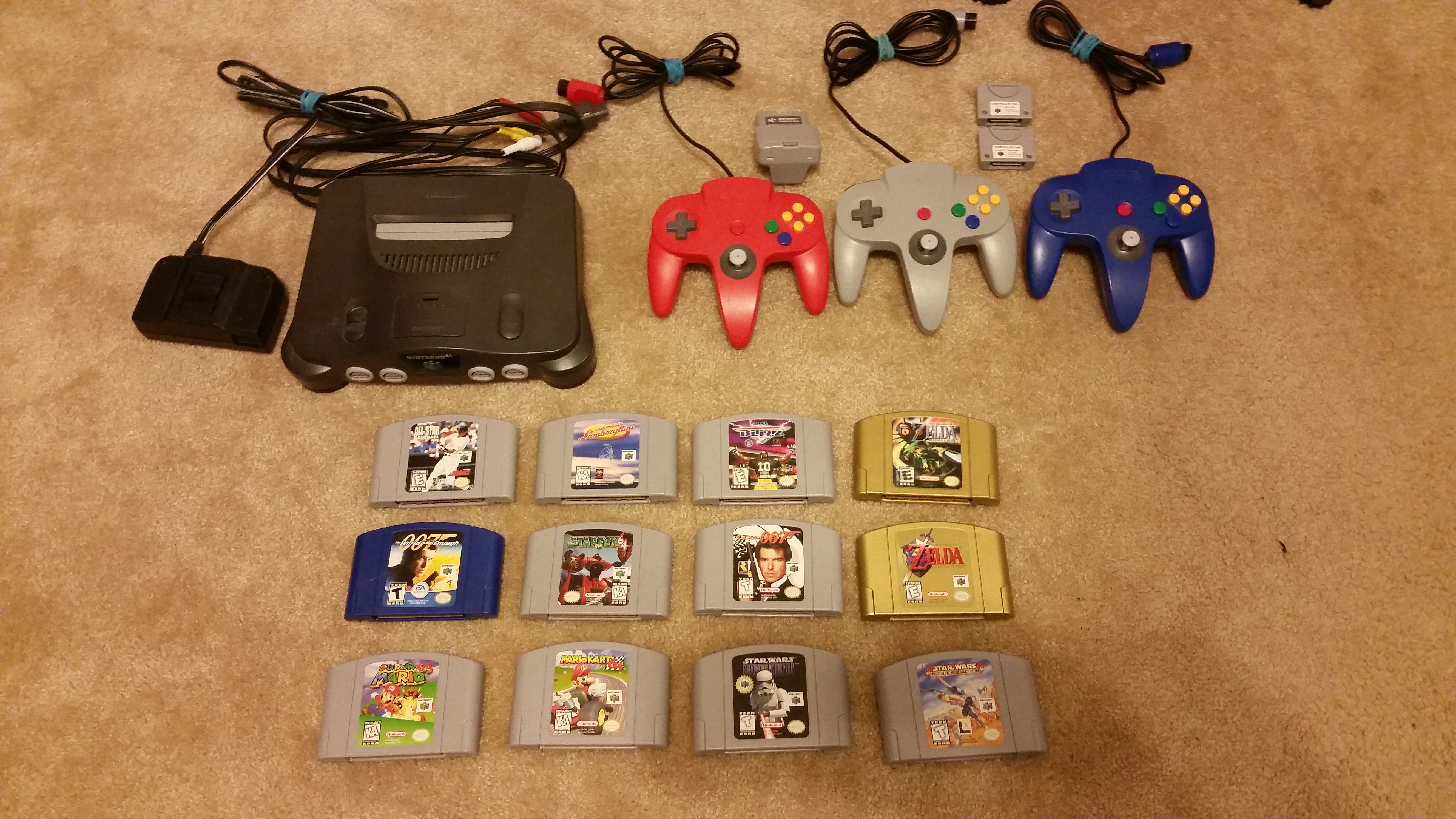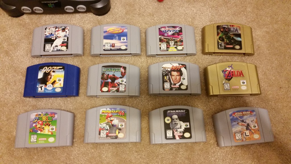 So my co-worker informed me earlier this year he would be leaving, taking a new job. He then asked me if I was seriously interested in buying his Nintendo 64. I told him absolutely. The next day, he brings a large cardboard box with the Nintendo 64 system, three official controllers, one rumble pack, two controller paks, and a total of twelve loose games that included; Super Mario 64, Mario Kart 64, The Legend of Zelda Ocarina of Time & Majora’s Mask gold cartridges, GoldenEye 007, Star Fox 64, Star Wars Rogue Squadron & Shadows of the Empire and a couple more games.
